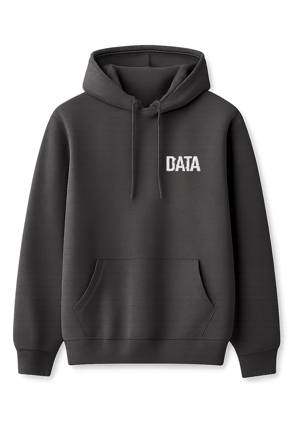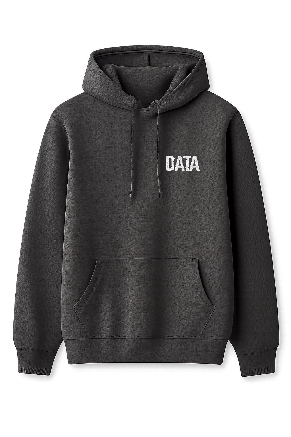 A 50% cotton/50% polyester grey hoodie featuring the DATA logo on the front.