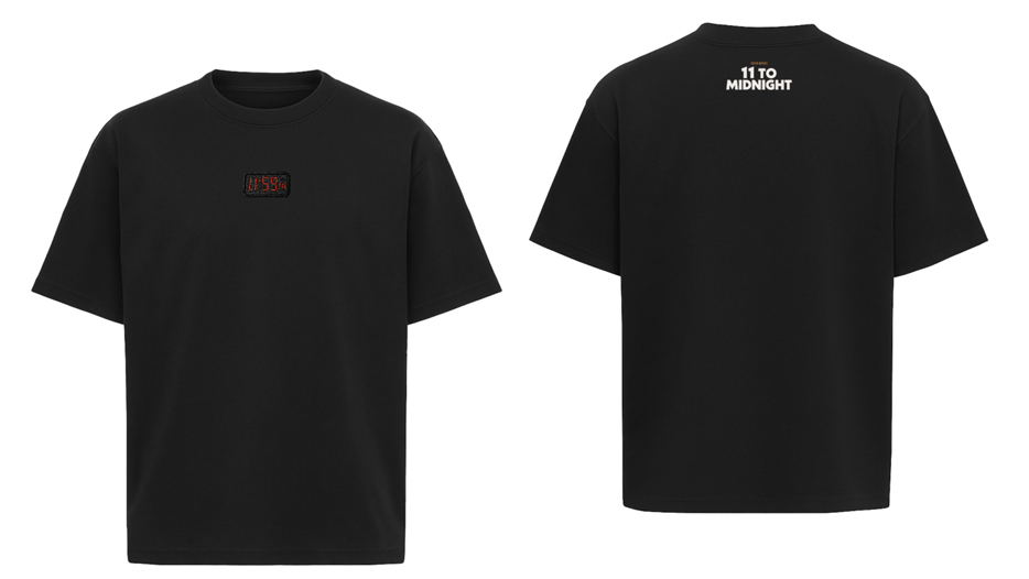 A 7.05 oz black 100% cotton t-shirt featuring the a digital clock embroidered patch of 11:59 and the show logo on the back.